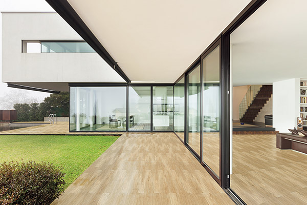 マットとグリップのあるシリーズでは室内から室外までを同じ柄で統一可能。天然木ではできない空間を作ることもできます。