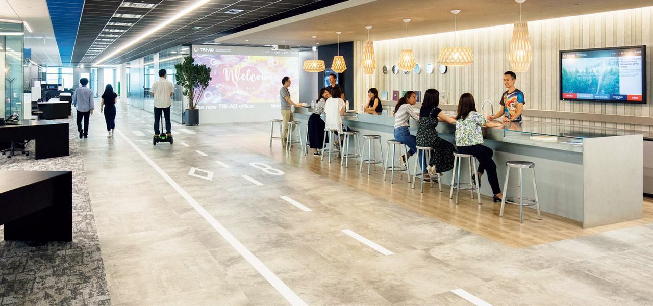 超大判サイズで素材感を余すところなく表現。オフィスの空間を広々見せることができます。 置敷き施工で改装が多いオフィスなどに簡単に施工できます。オフィスのレイアウト変更の場合でも貼り替えが素早く出来ます。 WAX不要で日々のメンテナンス、キャスター性にも優れレイアウト変更もゾーニングも自由自在です。