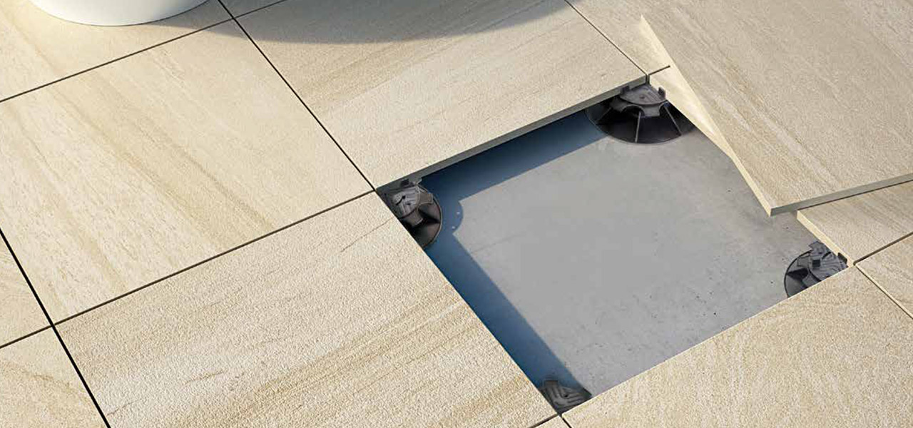 住宅のベランダや屋上・テラスなどの高さを無段階で調整することができる乾式無段階浮床工法です。 サポート材(束)はクギやビスを使用しない置敷き施工でなので現場を傷つけることはありません。高さは9.6mmから340mmまでの高さをサポートし、傾斜も勾配プレートで調整可能です。無段階調整式によるスピーディーな設置と、確実なレベル調整をお約束。目地から流れ落ちる雨水はすばやくマルチフットの間を流れ、ドライな床面を実現します。