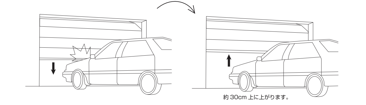 ガレージドアを閉じている最中、パネルの動作軌道上に 自動車などの障害があり当たった場合、安全装置が働きパネルが上へ約30cm上がります。通常の状態に戻すには、リモコンのボタンを押しガレージドアを1度全開まで開いてください。安全装置の働く負荷は15kgからとなっております。