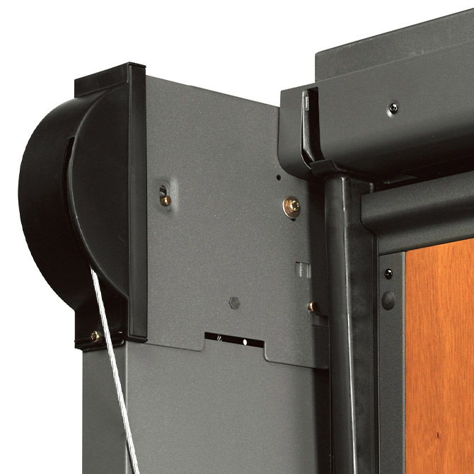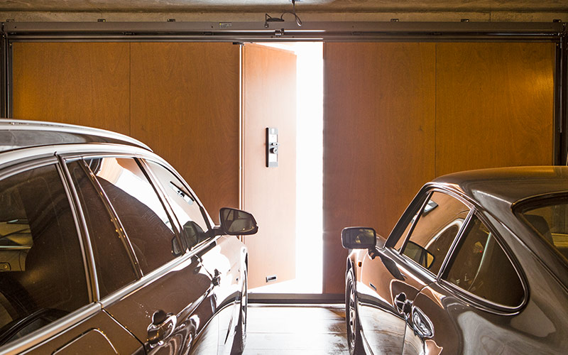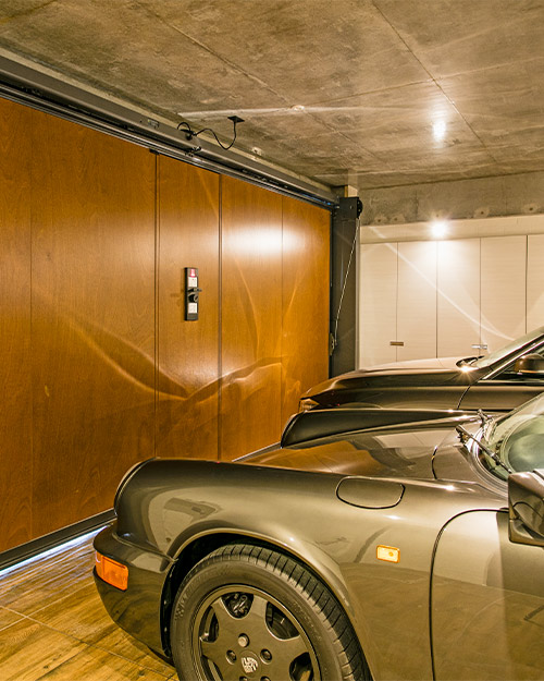 スムーズな入出庫が可能です。錘で扉が開く力をサポートする方式の為、天井レール不要。ガレージ内部の天井がすっきり仕上がります。