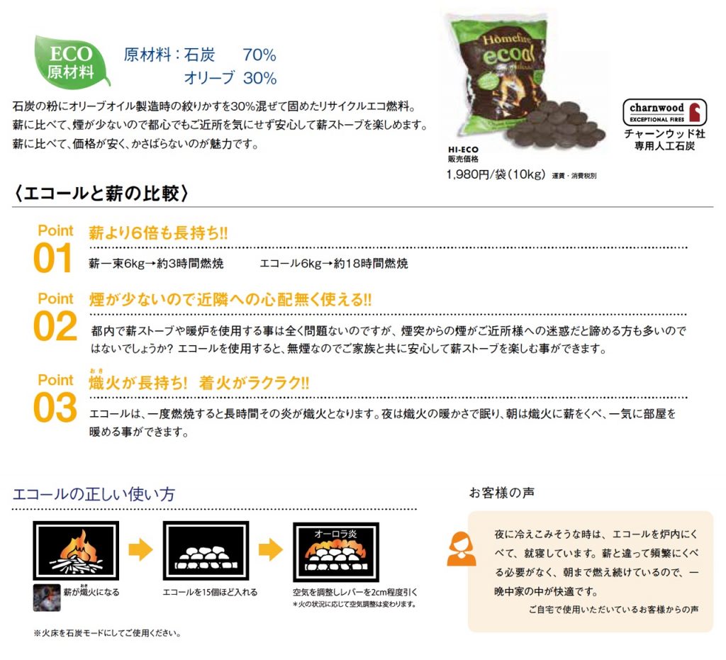 「エコール対応」マークがついている機種については、チャーンウッド社専用人工石炭「エコール」が使用できます。