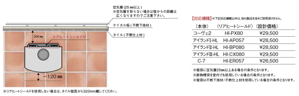 2.リアヒートシールドを使用した場合は、タイル壁面から200mm離せば設置可能です。