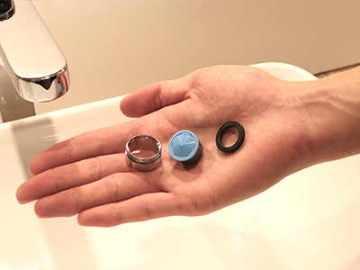 金属部分からエアレーターを取り外し、交換します。ゴムを取り付け忘れると正常に吐水しませんのでご注意ください。 |