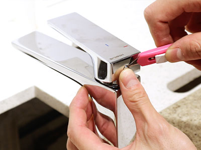 3.水栓ハンドル背面のネジ穴キャップを外す