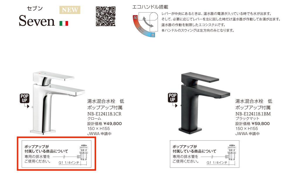 カタログもしくはデジタルカタログの水栓に赤枠の表記があれば、ポップアップが付属しています。