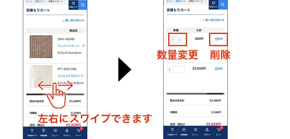 商品画像を右にスワイプ(スクリーンを指で押した状態のまま、左右にスライドさせる)すると、数量の変更するボタンが出ますのでこちらから数量変更、削除することができます。