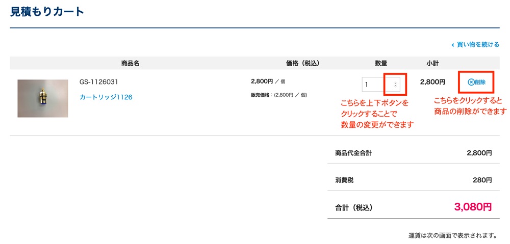 数量の変更は数量の横の上下ボタンをクリックすることで変更が可能です。