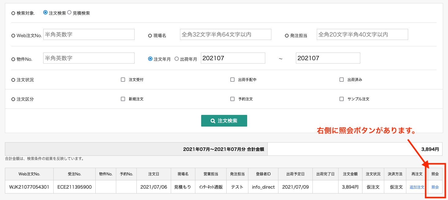 請求書の発行についてはWEB受注システムに入っていただき、注文検索・追加注文のボタンから注文を検索します。