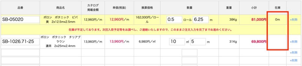 在庫数量がご発注数量に満たない場合、「在庫が不足しております。」とメッセージが表示されます。在庫がある場合は何も表示されません。