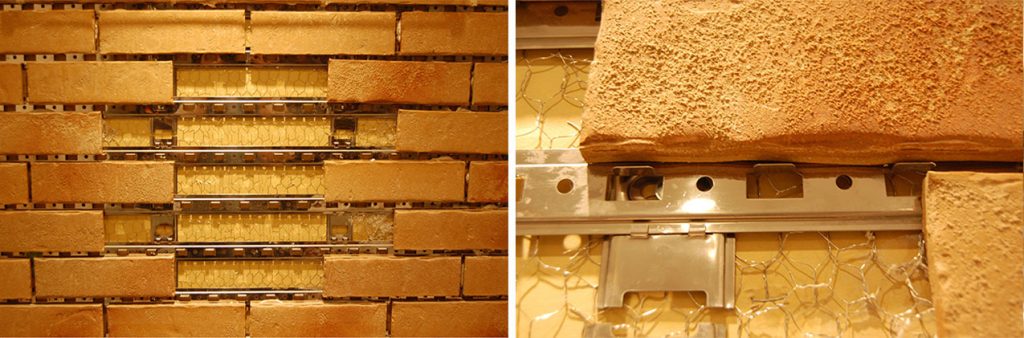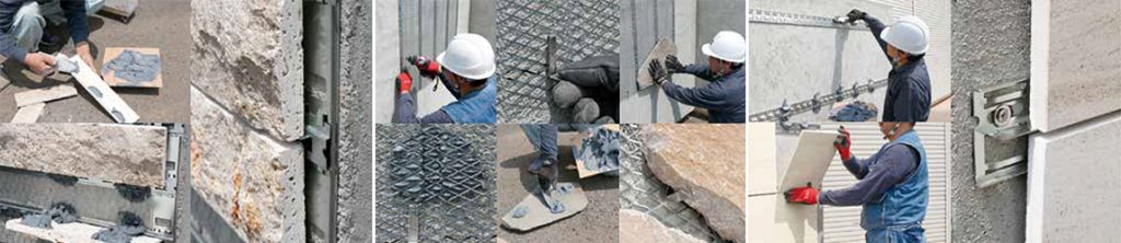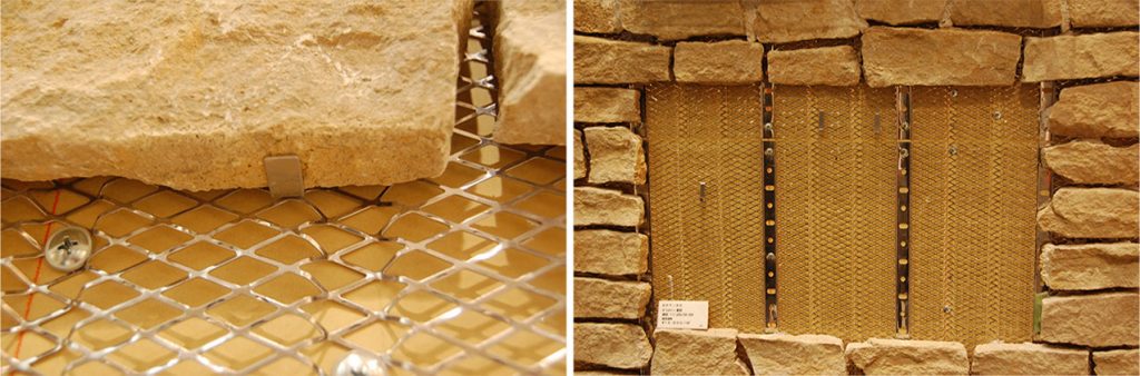 強度の高いステンレス及び新鋼板のパンチングを使用。無数の孔を接着剤が通過し固化する結合工法の為、石材やタイルの落下を防ぎます。また、石材を結合し