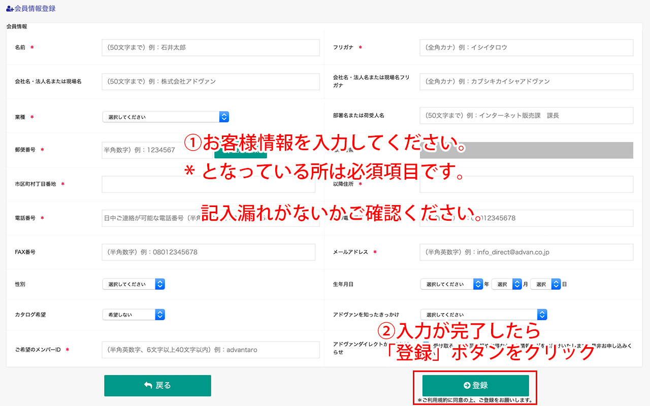会員登録手続きは簡単です。お名前や住所、メールアドレスなどのお客様情報を入力し、「登録」ボタンをクリックしてください。