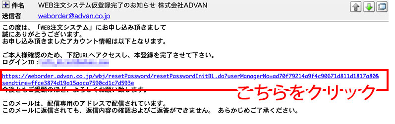 お客様情報入力が完了するとご登録のメールアドレスに「WEB注文システム仮登録完了のお知らせ」というタイトルの仮登録メールがweborder@advan.co.jpから届きますのでご確認ください。