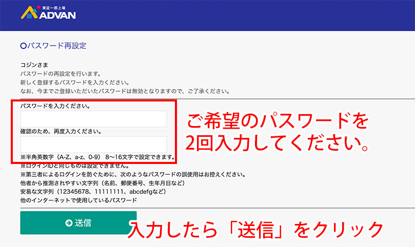 「パスワードの再設定」のページへ移動しますのでご希望のパスワードを2回入力して「送信」ボタンを押してください。これで会員登録は完了です。