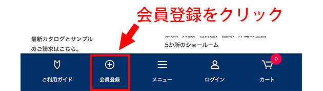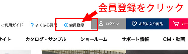 ウェブサイト上部に「会員登録」がございます。こちらをクリックしてください。