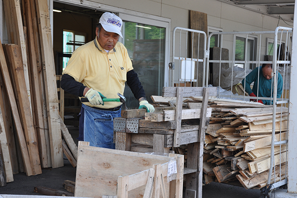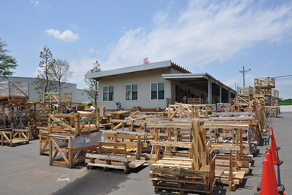 ほぼ全ての取扱商品は、木枠パレットに梱包され、海外から日本まで輸送されてきます。その木枠パレットを解体し、新たな木枠パレットを製作し、国内輸送に再利用しています。