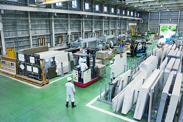 石材やタイルの加工で一番汚れやすい加工場の床には、鉱物骨材配合の散布型美装床仕上材を使用。通常のコンクリートの約4倍の耐摩耗性と防塵機能を誇り、フォークリフトの走行で床が削れることはありません。建物全体は掃除が簡単にできるように設計され、常にクリーンで快適な空間を維持できるようになっています。