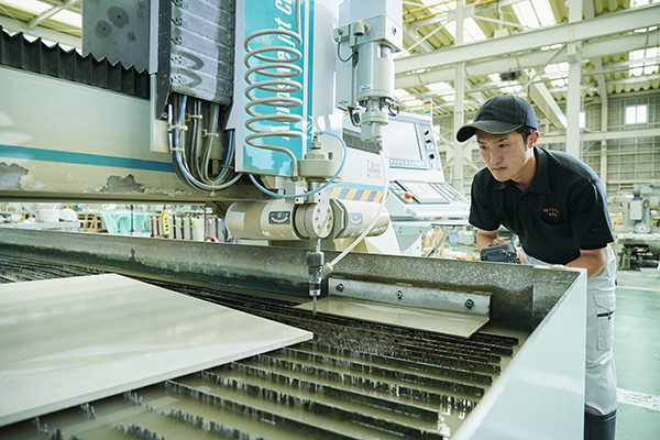 世界最新鋭の加工機を導入し、石材、セラミックタイル、塩化ビニル床材などの加工を行っています。これにより、事業主、施主、設計士、インテリアデザイナーのこだわりを効率的かつ正確に形にすることができます。これらの機械を操作するのは20代を中心とする若手エンジニアたちです。