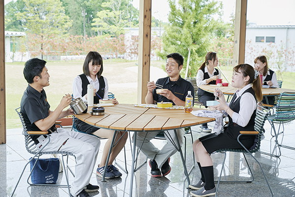第1食堂と第2食堂の2か所の食堂を完備。第2食堂にはデンマーク製の最新アウトドア家具が配置されたテラス席があり、気持ちの良い季節には桜を見たりしながら、ピクニック気分で昼食が楽しめます。