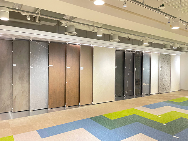 カタログでは確認が難しい商品の質感や色味、使い心地はショールームで実際にご体感ください。タイルやビニル床タイルなどはマテリアルのリアルさに驚くこと間違いなし。本物の石材などと見比べることもできます。