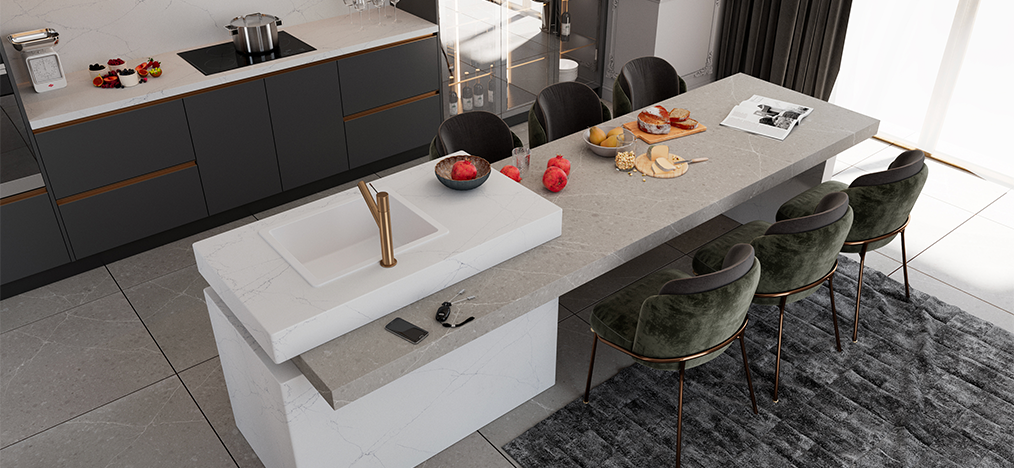 最先端の技術で天然石の魅力と機能性をさらに引き出した大判スラブ。耐久性、デザイン性、衛生、メンテナンス性を備えています。